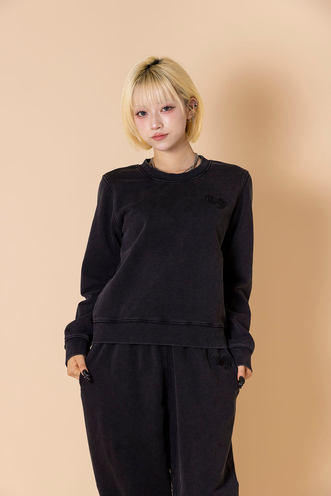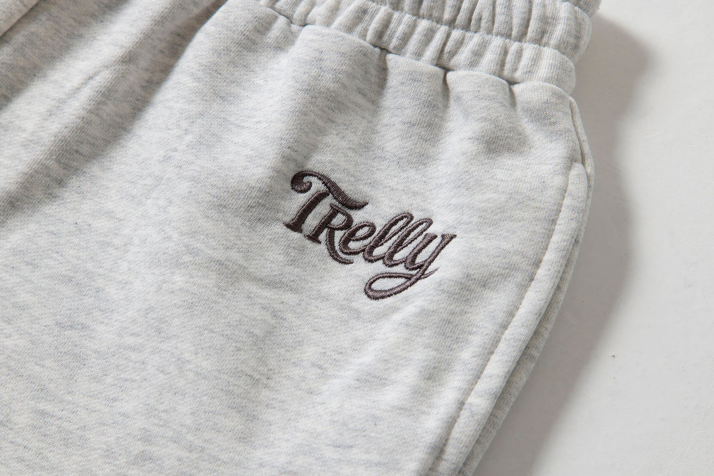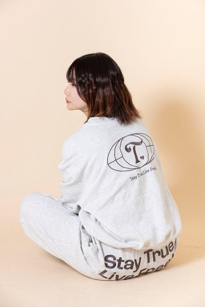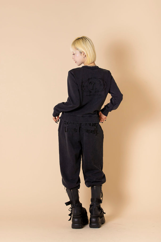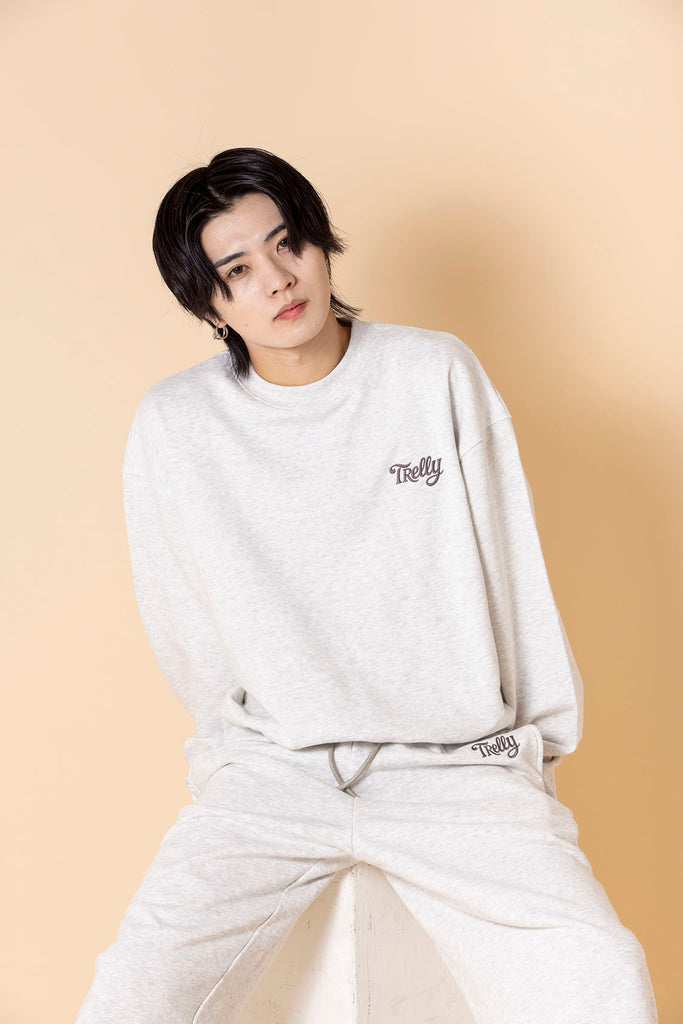 スウェットの胸元と背中に施された刺繍が、存在感を演出するセットアップ。